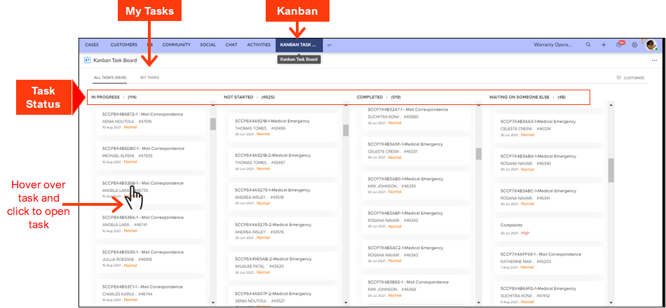 Use the Kanban Task Board to see your work organized by statuses, such as Not Started, In Progress, Waiting on Someone Else, and Completed. There are a variety of statuses based on your team's standard operating procedures.