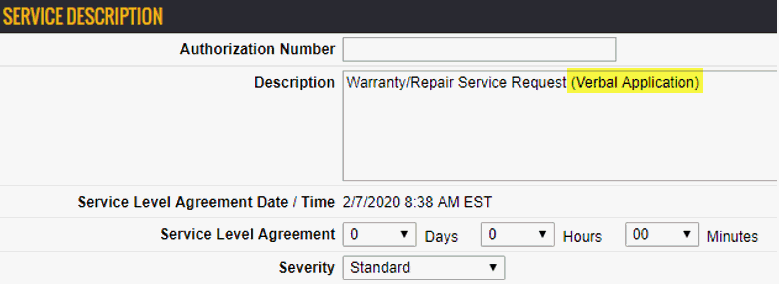 3. | Service description: Warranty/Repair Service Request (Verbal Application) | |
